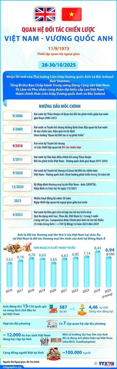 Nhận lời mời của Thủ tướng Liên hiệp Vương quốc Anh và Bắc Ireland Keir Starmer, Tổng Bí thư Tô Lâm và Phu nhân cùng đoàn đại biểu cấp cao Việt Nam thăm chính thức Liên hiệp Vương quốc Anh và Bắc Ireland từ ngày 28 đến 30/10/2025.
