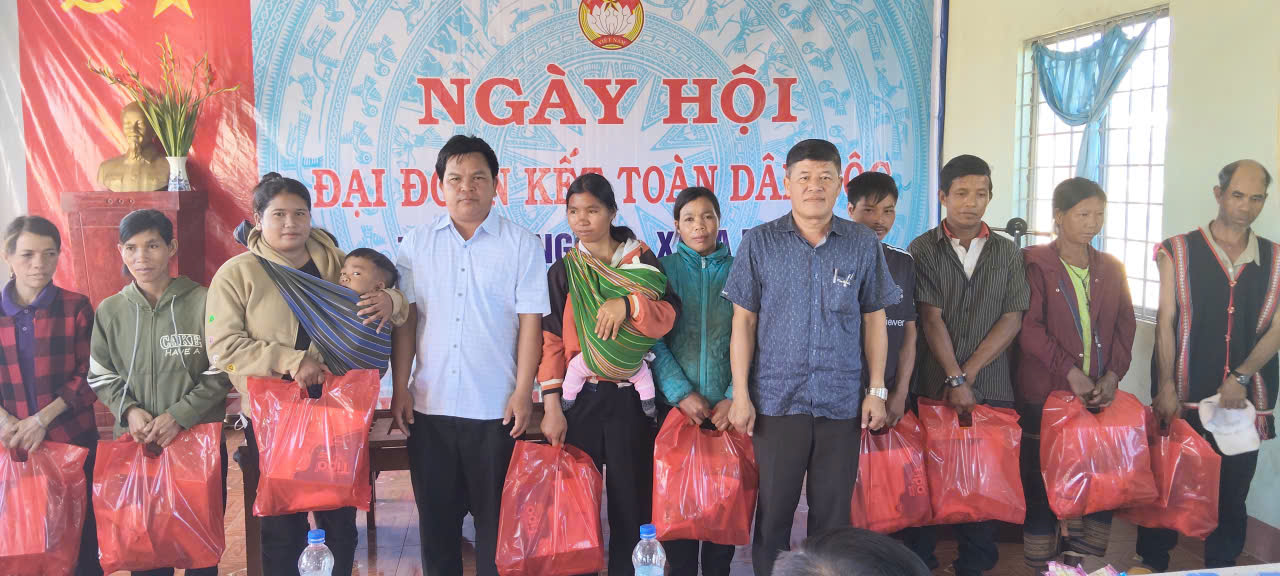 Lãnh đạo xã Ia Băng trao quà cho các hộ nghèo thôn Bông Lar nhân Ngày hội Đại đoàn kết toàn dân tộc năm 2025.