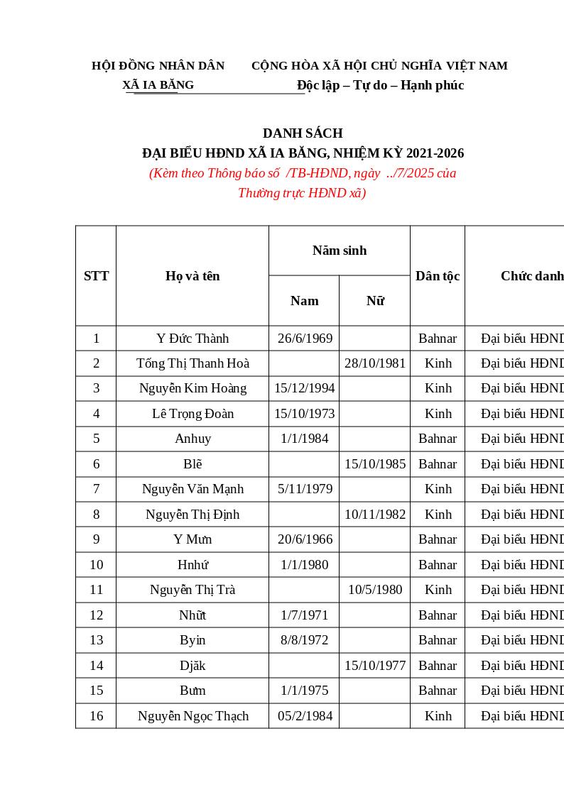 | Tiêu đề văn bản | DANH SÁCH ĐẠI BIỂU HĐND XÃ IA BĂNG, NHIỆM KỲ 2021-2026 | ||