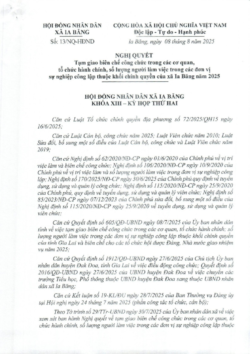 Tiêu đề văn bản | Nghị quyết tạm giao biên chế công chức trong cơ quan tổ chức HC, số lượng người làm việc trong các đơn vị sự nghiệp công lập thuộc khối chính quyền xã Ia Băng | ||