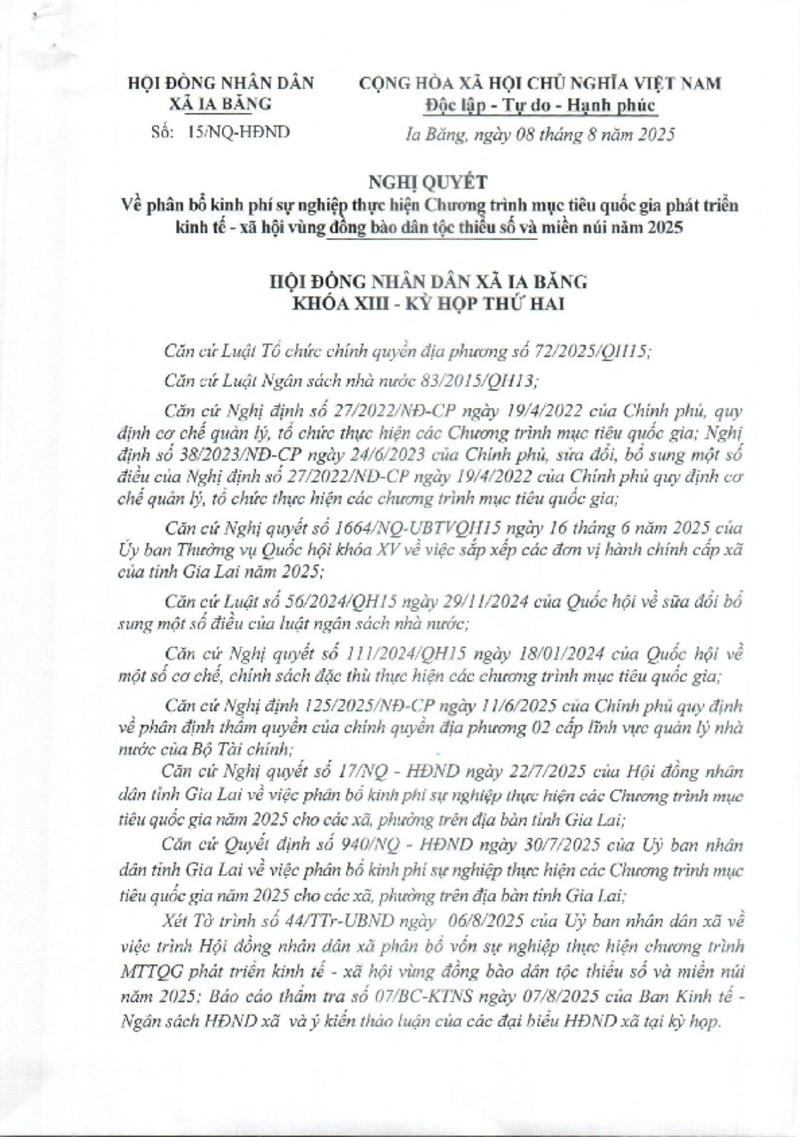 Tiêu đề văn bản | Nghị quyết về phân bổ kinh phí sự nghiệp thực hiện chương trình mục tiêu quốc gia phát triển kinh tế xã hội vùng ĐBDTTS và Miền núi | ||