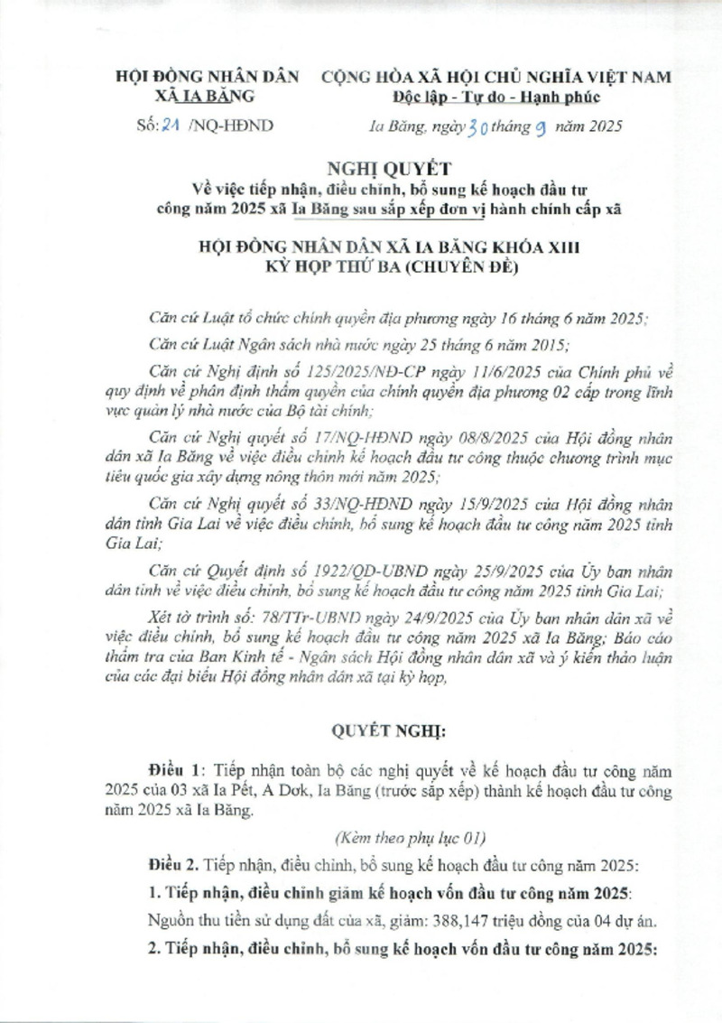 | Tiêu đề văn bản | NQ về việc tiếp nhận điều chỉnh, bổ sung kế hoạch đầu tư công cấp xã 2025 sau sắp xếp đơn vị hành chính cấp xã | ||
