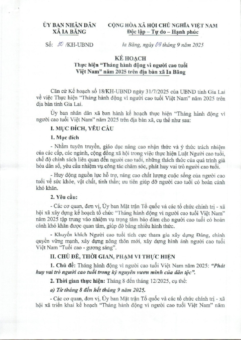 Tiêu đề văn bản | KẾ HOẠCH Thực hiện “Tháng hành động vì người cao tuổi Việt Nam” năm 2025 trên địa bàn xã Ia Băng | ||